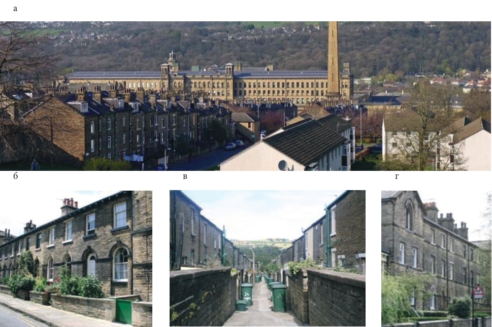 Рис. 2. Фабричный посёлок Солтейр в Англии: а) общий вид [15]; б) в) г) – примеры жилых домов для работников [16].