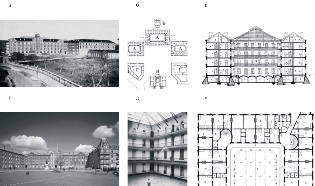 Рис. 3. Фамилистер в Гизе, Франция. 1859-1877 гг.: а) общий вид – 1864 г. [20]; б) схема генерального плана [21]; в) разрез центрального здания [20]; г) общий вид – 2016 г. [20]; д) двор-атриум центрального здания, 1897 [20]; е) фрагмент плана центрального здания [20].