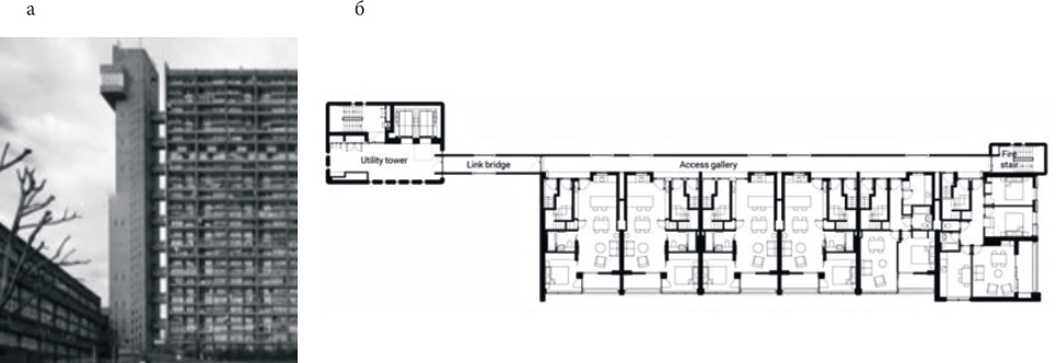 В 1960-е гг. в Соединённом королевстве развитие получают и комплексы муниципального жилья. В 1965-1967 гг. по заказу Совета Большого Лондона архитектор Эрно Голдфингер запроектировал жилой дом повышенной этажности – башню Балфрон (англ. Balfron) в стиле брутализм с муниципальными квартирами для нуждающихся семей. Отдельная лестнично-лифтовая секция 31-этажного здания через каждые три этажа соединена переходом с галереями, ведущими к небольшим жилым ячейкам (рис. 5а). Они расположены в трёх уровнях друг над другом. Квартирография нестандартная: есть студии с выделенными спальнями и кухнями-нишами, двухкомнатные квартиры с кухнями, трёхкомнатные квартиры с кухнями-столовыми. Каждая квартира имеет большую лоджию (рис. 5б). Общее количество жилых ячеек – 146. Вскоре после заселения башня стала магнитом для преступников, однако своевременно принятые меры безопасности позволили предотвратить социальную и физическую деградацию объекта. Больше того: комплекс получил статус памятника исторического наследия, что сделало его местной достопримечательностью. В 1972 г. проект был использован ещё раз: в другом районе Лондона появилась аналогичная башня Треллик (Trellick Tower) [29, 30].