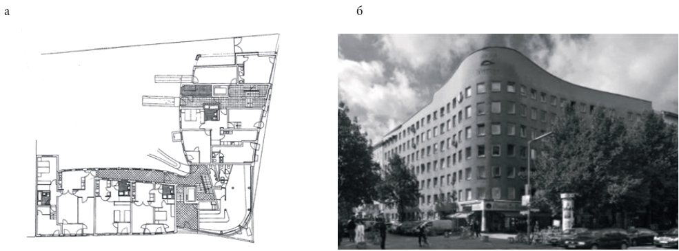 Внимание экспертов на выставке 1989 г. было привлечено к работе португальского архитектора Алваро Сиза Виейра. Экономически оптимальный жилой дом для мигрантов, построенный в 1980 г. у Силезских ворот (Wohnhaus Schlesisches Tor), стал первой постройкой архитектора за пределами родной страны. Угловое 7-этажное модернистское здание со скруглёнными уличным и дворовым фасадами (рис. 6а) состоит из двух секций, одна из которых несёт черты галерейной планировки (рис. 6б). Первоначально в проекте было предусмотрено 24 квартиры и 4 лестницы, но корректировка планировок позволила разместить на первом этаже коммерческие помещения, а на втором–седьмом этажах – 46 квартир эконом-класса и 2 лестнично-лифтовых узла. В городской среде здание выглядит визуально интригующим и противоречивым. Жесткий рисунок прямоугольных окон призван создать гармонию с окружающими постройками, но криволинейная форма служит отсылкой к немецкому экспрессионизму. Благодаря этому здание выделяется на общем фоне (рис. 4). Дом позже стал популярен под названием "Bonjour Tristesse" («Здравствуй, грусть») – из-за тематического французского граффити на главном фасаде [31, 32].