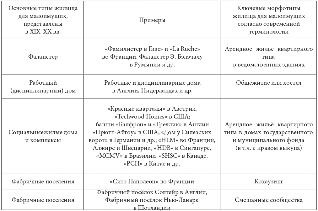 Анализ этих и других результатов исследования, связанного с историческими предпосылками развития современных методов проектирования жилья для социально уязвимых групп населения, в частности – мигрантов, позволяет выделить несколько ключевых морфотипов жилища, соответствующих современным социально ориентированным принципам проектирования (табл. 1):