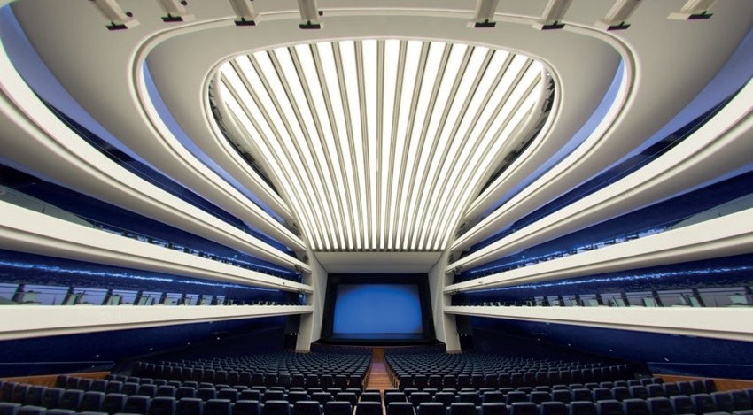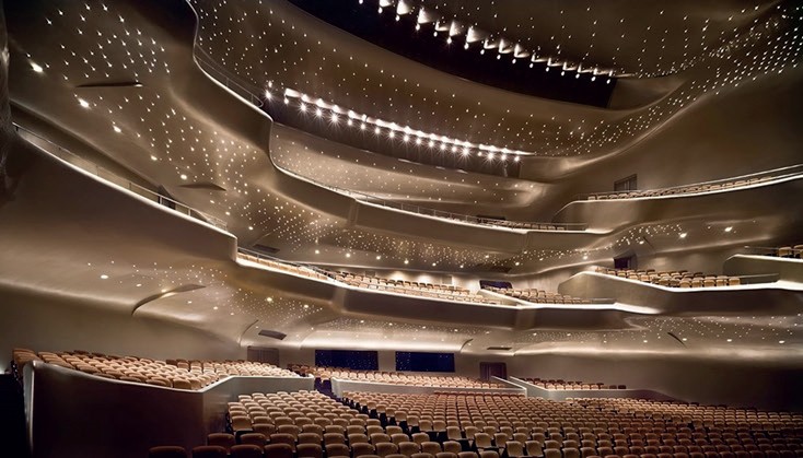 Центральным ядром комплекса является Оперный концертный зал (рис. 14). Зал состоит из четырех ярусов зрительных мест, одной из самых больших сцен в мире, оснащённую всеми основными удобствами и современными технологиями, и третью по величине оркестровую яму в мире, способную вместить до 120 музыкантов. Необычный изгиб балконов, линии парящего потолка и сверкающая белая отделка поразительно напоминают черты экстерьера здания. [16, 20]