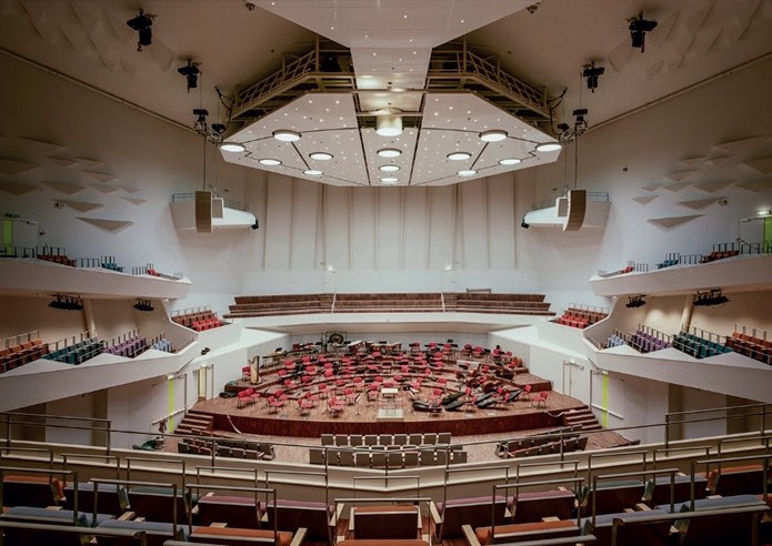 Несмотря на большую вместимость зала (2400 мест), пространство внутри филармонии кажется удивительно камерным. Ощущение можно объяснить математически: расстояние между дирижером и самым дальним зрителем составляет всего 32 метра. [12, 14] Уникальность зала также создается посредством подвесных акустических конструкций в форме облаков и консольных, парящих балконов (рис. 10). Данное решение сочетает в себе боковые отражения, прямой звук и реверберацию – для достижения превосходной четкости и прозрачности в теплом, обволакивающем резонансе. Зал также оборудован органом Ригера, специально разработанным для симфонического репертуара. [13, 14]
