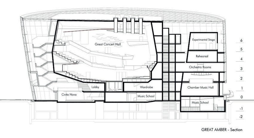 Рис. 5. Разрез концертного зала Great Amber (Великий Янтарь), Лиепая, Латвия, 2015, арх. Фолькер Гинке