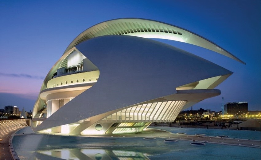 Его высота составляет 75 метров, а под металлической, широкой конструкцией с изогнутой крышей, длиной 230 м, расположено само здание площадью 40 000 м². Новаторская архитектура этого здания, спроектированная Сантьяго Калатравой, вмещает четыре сценические площадки (рис. 12): для оперы (на 1706 мест), театра (на 1520 мест), музыки (на 380 мест) и балета (на 400 мест). [2, 16, 18, 19]
