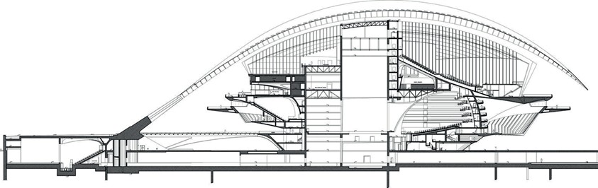 Рис. 13. Дворец искусств королевы Софии, Разрез 1-1, Валенсия, Испания, 2006 г., арх. Сантьяго Калатрава
