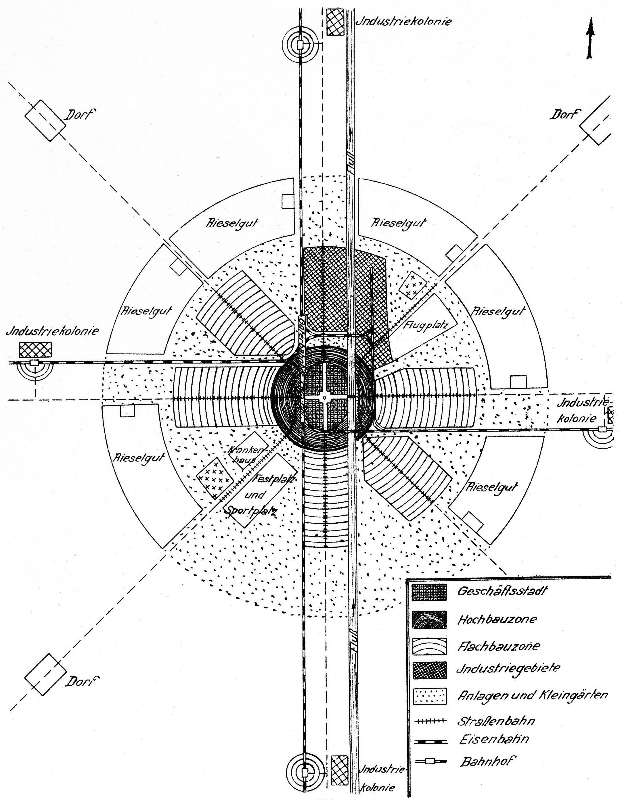 В своей книге Хайлигенталь полностью обобщил весь предыдущий опыт немецкого градостроительства, включая и его чисто национальные особенности. Так, в предложенной им примерной схеме идеального большого города XX в. (рис. 1), с одной стороны можно заметить непосредственное влияние идей города-сада Эбенизера Говарда, а с другой стороны обращают на себя внимание обширные площади, отведённые в схеме города для полей орошения – а эта технология очистки сточных вод города ни в одной стране мира, кроме Германии, так и не смогла получить широкого распространения.