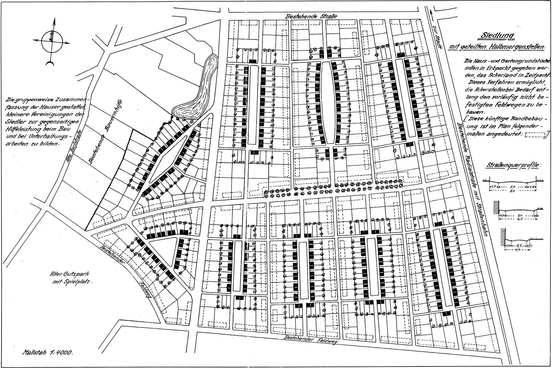 Если приведённая из административного отчета Ассоциации Большого Берлина схема застройки города на ровной местности (рис. 2) полностью соответствовала градостроительным идеям Staffelbauordnung, реализованным в 1904 г. Теодором Фишером в его генеральном плане застройки и расширения Мюнхена [15], то предложенный самим Романом Хайлигенталем в 1921 г. в конце книги план застройки для поселения в пригороде Берлина (рис. 3), непосредственным образом предвосхищал впервые реализованную Отто Хеслером в 1924 г. в поселении Георгсгартен строчную застройку [7], ставшую отличительной особенностью поселений Нового строительства Веймарской республики в 1920-х гг.