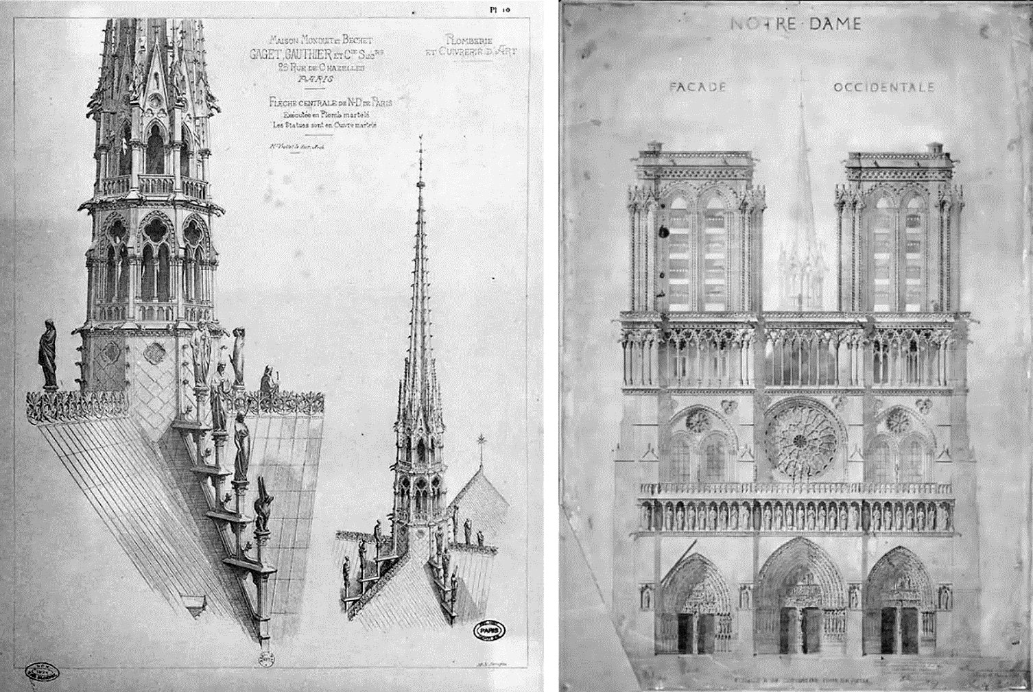 Реставрационные работы Эжена Виоле ле Дюка в Соборе Парижской Богоматери, сделанные в XIX веке, широко известны своим тщательным вниманием к исторической точности и вкладом в сохранение и возрождение архитектуры собора. Реставрация началась с всесторонней структурной оценки. Архитектор определил слабые места, включая поврежденную или пришедшую в негодность каменную кладку, и разработал планы по стабилизации конструкции. Одним из его наиболее значительных вкладов было укрепление контрфорсов собора, которые помогли нейтрализовать выступающие наружу стены и сохранить структурную целостность. Шпиль, отсутствующий на протяжении веков, был восстановлен между 1844 и 1864 гг. на основе принципов готической архитектуры и стал символом возрождения собора (рис. 3).