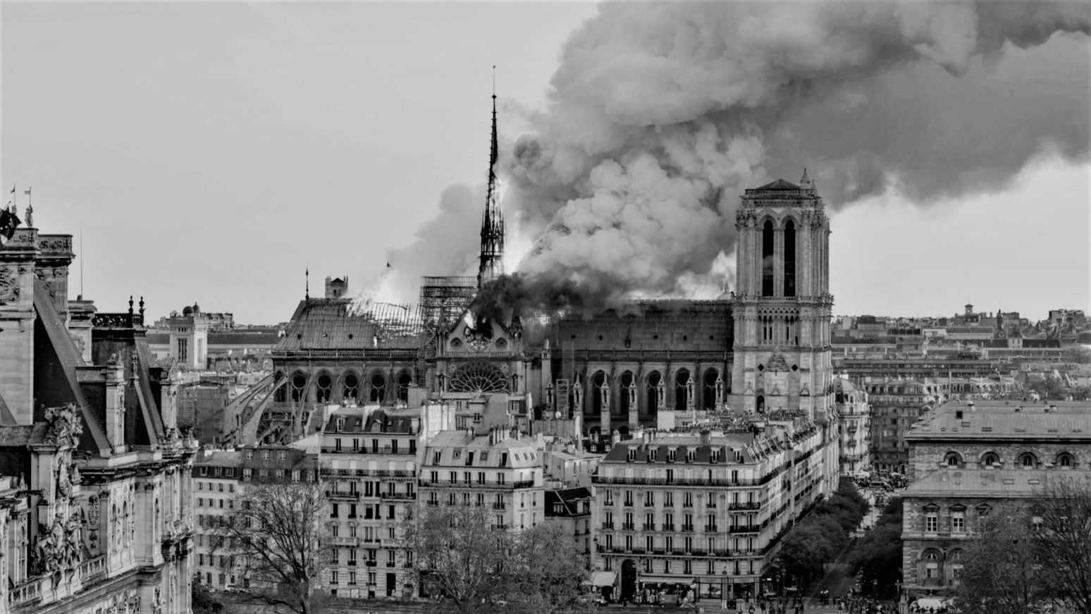 15 апреля 2019 г. в соборе начался пожар (рис. 4), уничтожив шпиль и «лес» дубовых балок, поддерживающих свинцовую крышу. Предполагалось, что возгорание было связано с продолжающимися ремонтными работами. Шпиль собора рухнул в 19:50, обрушив около 750 тонн камня и свинца. Находящимся внутри пожарным приказали отступить. К этому времени огонь перекинулся на северную башню, где находились восемь колоколов. Пожарные сосредоточили свои усилия на башне. К 21:45 им наконец удалось взять огонь под контроль. Основная конструкция была цела; пожарные спасли фасад, башни, стены, контрфорсы и витражи. Большой орган с более чем 8000 трубами, построенный Франсуа Тьерри в XVIII веке, также был спасен, но пострадал. Каменный свод, образующий потолок собора, имел несколько отверстий, но в остальном остался целым. Огонь уничтожил шпиль и нанес значительный ущерб крыше, сводам и интерьеру собора.