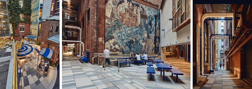Этот проект является частью оживления общественной инфраструктуры университета RMIT, находящегося в Мельбурне, Австралия (рис. 1). Проект был реализован в 2019 г. Для ревитализации территории университетского кампуса архитекторы объединяют лабиринт малоиспользуемых переулков и превращают эти пространства в яркое и гостеприимное место. Проектное решение сосредоточено вокруг двух внутренних дворов, которые выступают в качестве якорей культурно-социальной активности. Среди цветочниц-кашпо установлены нестандартные скамьи, теневые конструкции, а также увеличено освещение. В функциональном плане территория приросла павильоном клуба любителей манги, стойкой с продажей лимонадов, а также крытой площадкой для настольных игр.