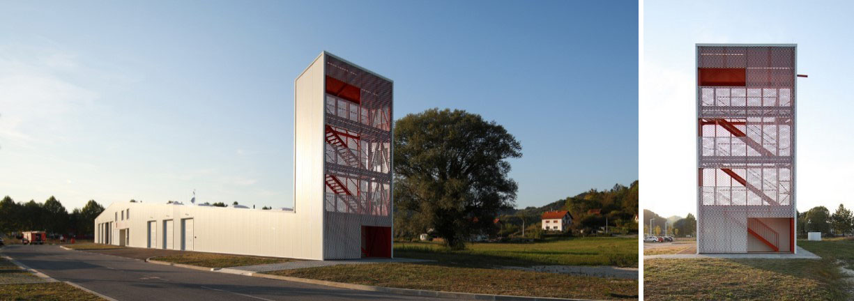 Вместе с тем, в ландшафте появился акцент: им стала обзорная башня. Различия в цветах и текстурах служат задачам функционального зонирования: белый металл отвечает за помещения для хранения транспорта, необработанный бетон – за пространства для работы и отдыха, красный – за пути коммуникации. Лёгкие стальные перфорированные панели фасада белого цвета приглушают яркость красных элементов интерьеров. Важно, что наряду с железобетоном авторы проекта использовали в несущих конструкциях повторно используемый металлический каркас [5, 6].