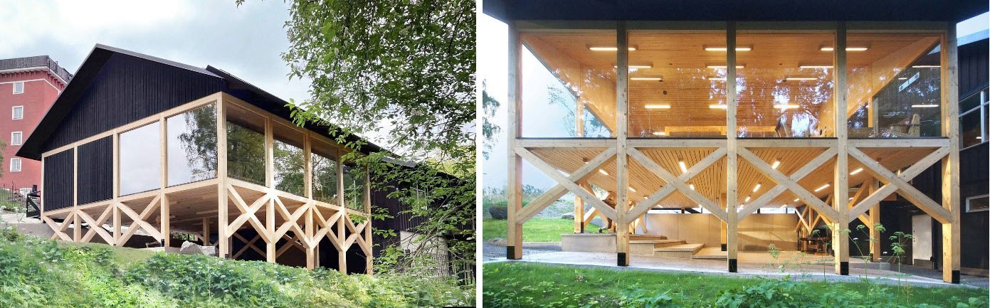 Релевантные примеры таких объектов можно обнаружить не только на удалённых от зон урбанизации территориях. Иногда адекватность проектных решений обнаруживается и в городах. Таким примером может служить небольшое здание двойного функционального назначения (рис. 3), возведённое на склоне в Королевском национальном городском парке Норра Юргорден в Стокгольме (2021 г., арх. бюро Anders Berensson Architects). Одна половина здания – офис, другая – место для проведения мероприятий на открытом воздухе. Все основные элементы лаконичны и сделаны из дерева: потолок – из сосновых досок, стены ‒ из сосновой фанеры, перекрытия – из еловой решётки, обшитой дубовыми досками, потолок и все светильники облицованы деревом, а преобладающая часть мебели изготовлена из остатков материалов со строительной площадки. Каркас из клеёных деревянных балок и стоек, укреплённый крестовинами, заполнен стеновыми панелями и витражами в верхней части, а внизу оставлен открытым, в виде ниши – как навес от непогоды. Здесь уклон рельефа позволил разместить даже небольшой амфитеатр со сценой. Стальные детали окрашены в чёрный цвет. Отдельным элементам крепежа конструкций придана стилизованная форма животных – обитателей Королевского национального парка [7].