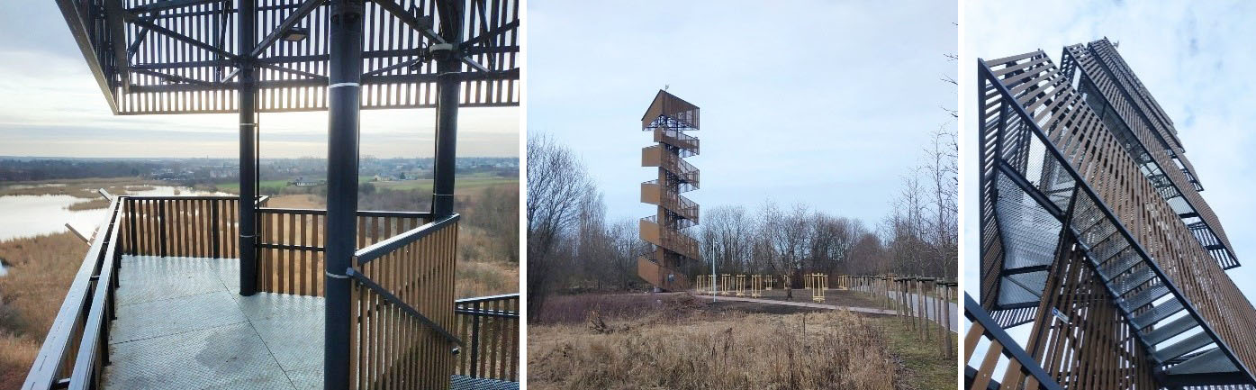 Повышению привлекательности природных пейзажей способствует возведение смотровых (обзорных) башен. Для их строительства выбираются места наилучшего обзора окрестностей. Один из примеров находится на окраине Познани (Польша) (арх. Бюро Toya Design). Конструкция из стали общей высотой 25,6 м развивается по форме равностороннего треугольника со стороной 8 м. Лестница ведёт на высоту 22 м, где находится смотровая площадка. Металлическое ядро из трёх соединенных друг с другом колонн и ограждение облицованы вертикально расположенными композитными досками. Такое ажурное решение позволяет башне «раствориться» в окружающей среде. Она стала использоваться орнитологами для наблюдения за разнообразными птицами, но интерес представляет и ландшафт с культурными памятниками и материальными артефактами – остатками стен кирпичного завода, построенного для строительства Познаньской крепости. Башня имеет ночную подсветку и оборудована камерами видеонаблюдения (рис. 5) [9].