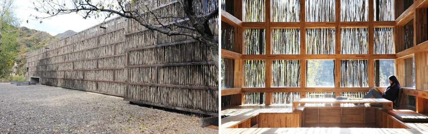Просветительская миссия ООПТ предполагает формирование зон для размещения лекториев и библиотек. Библиотека Ли Юань в Китае (2011, архитектурное ателье Li Xiaodong) расположена в деревне Хуайжоу, в двух часах езды от Пекина (рис. 6). Здание, с одной стороны, стало для деревни важным функциональным звеном, а с другой ‒ позволило подчеркнуть естественную красоту окружающего ландшафта. Участок был выбран не в центре, а неподалёку в горах. Такое решение имеет философскую основу: ценность знаний, полученных с приложением дополнительных усилий, возрастает. Благодаря деликатному и бережному включению в среду, здание не разрушает окружающий ландшафт. Эффект усиливает тщательный и тонкий подбор материалов, которые были найдены здесь же. Снаружи стены заполнены нерегулярными решётками из простых деревянных палочек, которые используются местными жителями в качестве топлива для кухонных печей. Внутреннее пространство здания с рассеянным естественным светом создает ощущение простора, а деревянная отделка способствует уюту и комфорту [10].