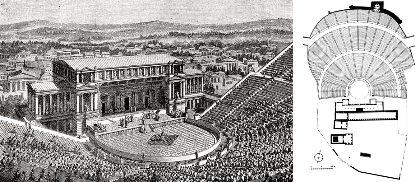 Рис. 1. Театр Диониса в Афинах, Греция, V в. до н.э. (из книги Harmsworth History of the World, 1908) и его планировка (kannelura.ru)