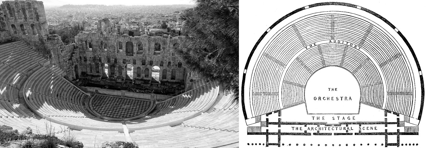 Вначале греческий театр представлял собой простую круглую сценическую площадку у подножья горы («орхестра»), а концентрические зрительные трибуны располагались вокруг нее по склону. Мраморные троны знати часто возглавляли первый ряд «театрона», реже последний [1, 2]. С развитием драмы в V веке греки стали пристраивать сзади орхестры гримёрную актеров – «скену». Между скеной и орхестрой добавляли приподнятую сцену «проскениум» для игры главных героев, а по бокам «параскенионы», предназначенные для сценических атрибутов [1, 2]. Начиная с Аристофана, появляется самостоятельная сцена и вместе с ней первые механизмы для трансформации театрального действия в горизонтальном и вертикальном направлениях. Для улучшения акустики между сценой и театроном ставили медные сосуды, резонировавшие звук [1]. Помимо зрелищных площадок на открытом воздухе существовали и крытые пространства – одеоны. Одно из самых известных сооружений данного типа находилось в Афинах, на Востоке от театра Диониса. Одеон Герода Аттика дошел до наших дней практически в первозданном виде и служит главной концертной площадкой Афин (рис. 2). Дата строительства неизвестна, предположительно, между 160 и 174 гг. н. э. [2].