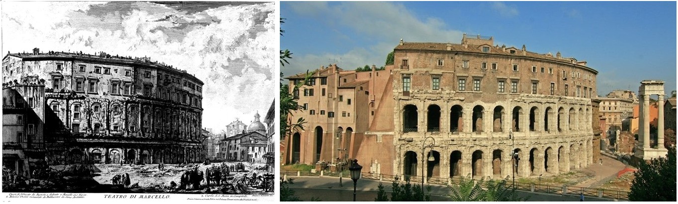 Рис. 4. Приспособление театра Марцелла под крепость, Рим, IX в. и его сегодняшнее состояние