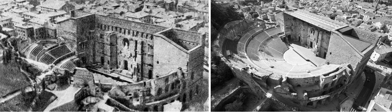 Рис. 5. Театр в Оранже, Франция, I в. до н.э. (antique.totalarch.com) и в наши дни (france-voyage.com)
