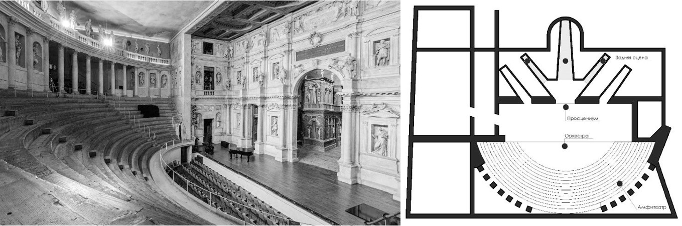 Рис. 7. Театр «Олимпико» в Виченце, Италия, арх. Андреа Палладио и Винченцо Скамоцци, 1580 г.: общий вид и план (admagazine.ru)