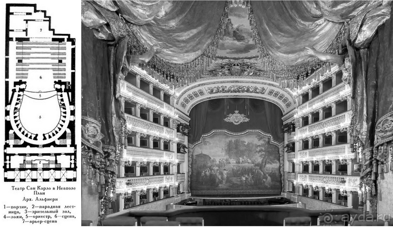 Рис. 11. Театр «Сан Карло» в Неаполе, Италия, 1737 г., арх. Бенедетто Альфиери, реконструкция: арх. Антонио Никколини: план (kannelura.ru) и зрительный зал (ayda.ru)