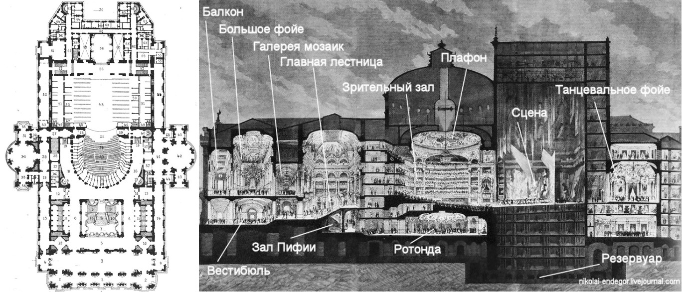 Рис. 12. Театр «Гранд Опера», Париж, Франция, 1862 г., арх. Шарль Гарнье: план (wikimedia.org) и разрез (nikolai_endegor.livejournal.com)