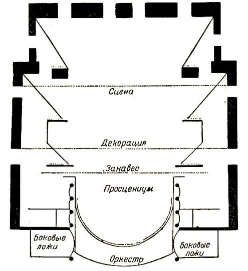Карл-Фридрих Шинкель был основоположником реформирования современного театра, предложив идеи, которые только спустя полвека стали реальностью. По мнению Шинкеля, сцена должна представлять собой широкую площадку – авансцену – в неподвижной раме просцениума, обозначающего обрамление картины всего театрального действия, которое разворачивается в неглубокой сцене, расположенной за просцениумом. Так он попытался соединить античный принцип неподвижной открытой сцены с глубинной (рис. 13) [2, 5, 6].