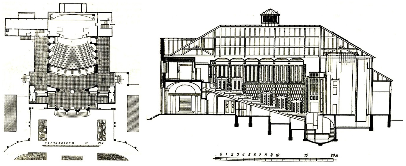 Рис. 14. Мюнхенский художественный театр, Мюнхен, Германия, 1908 г., арх. Макс Литтман: план и разрез (tehne.com)