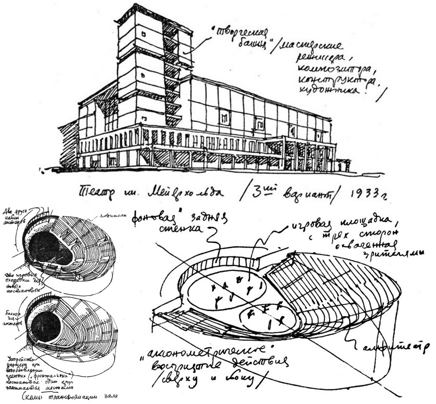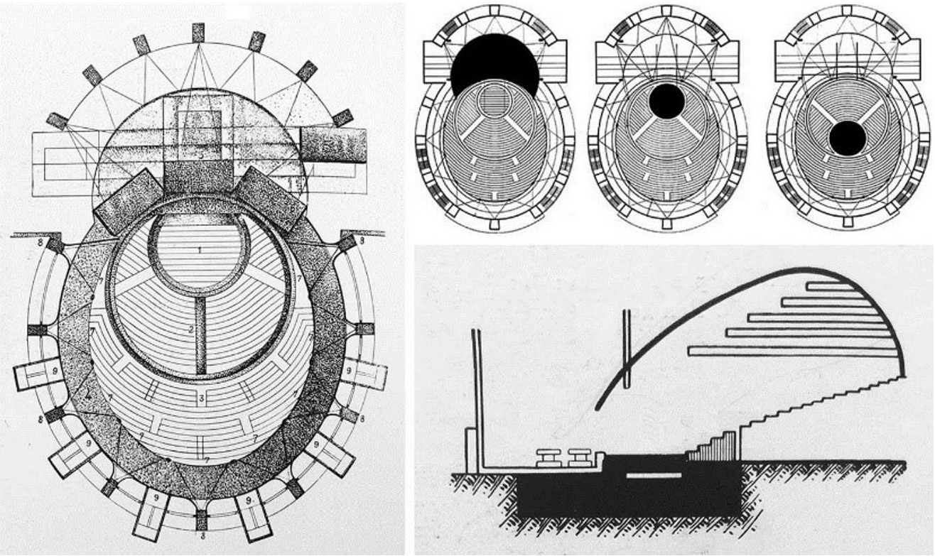 Рис. 17. Окончательный проект и концепция Государственного театра им. Мейерхольда, 1933 г., арх. М.Г. Бархин и С.Е. Вахтангов: внешний вид, трансформации зала и восприятие действия (muzobozrenie.ru)