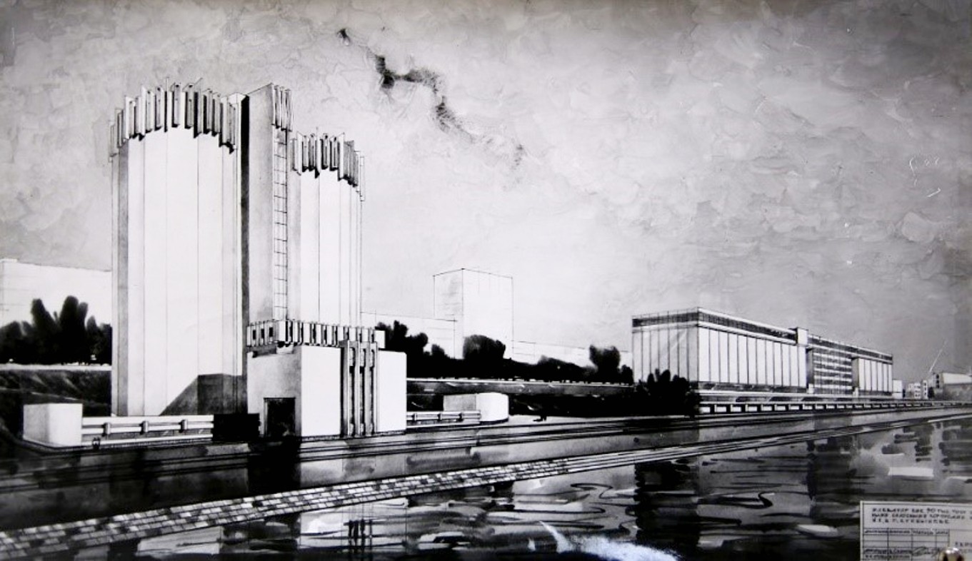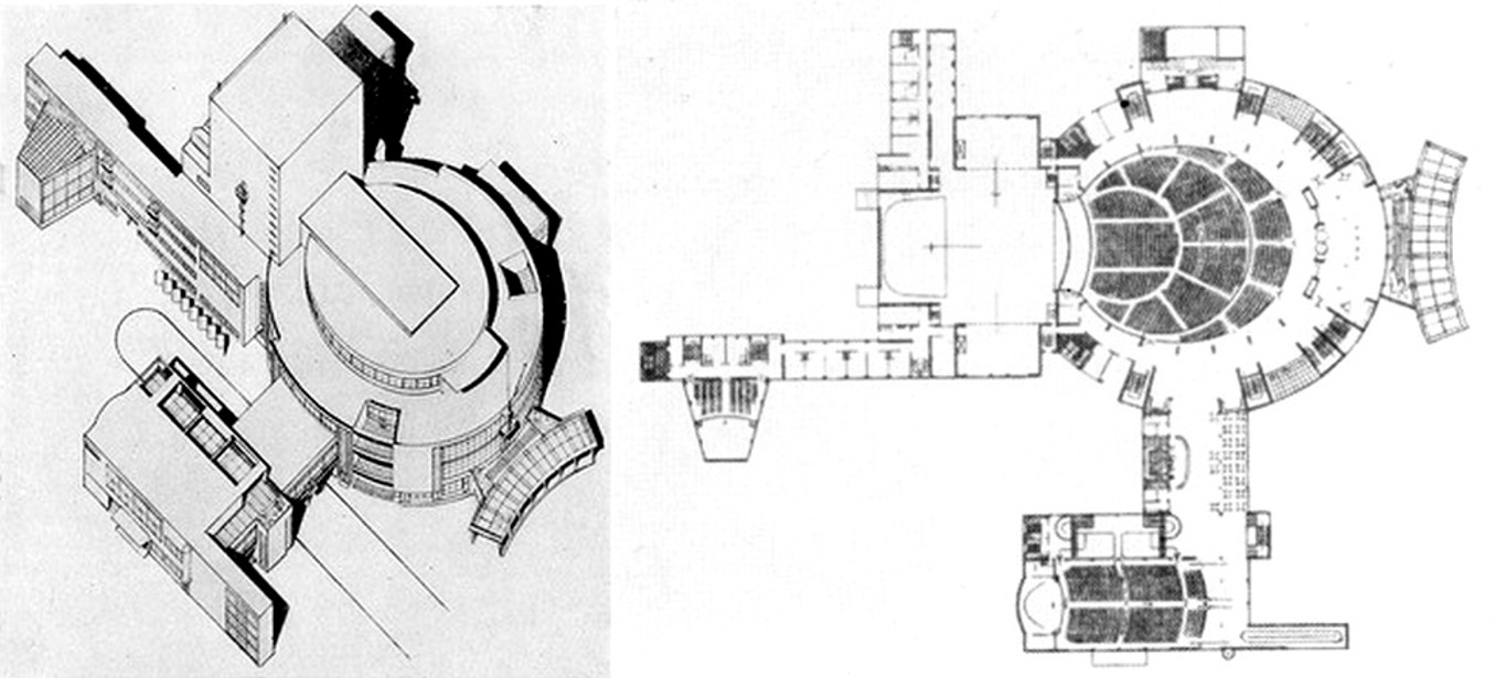 Рис. 16. Концепция «оперно-драматического театра» в Ростове-на-Дону, 1930 г., арх. М.Г. и Г.Б. Бархины: перспектива и план (kannelura.ru)