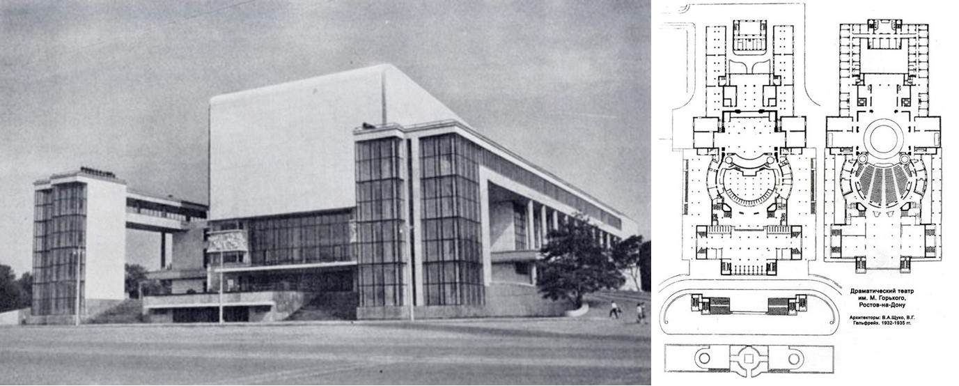 Рис. 18. Театр им. Горького, Ростов-на Дону, арх. В.А. Щуко, В.Г. Гелъфрейх, 1930-1935 г.: внешний вид и план (arx.novosibdom.ru)
