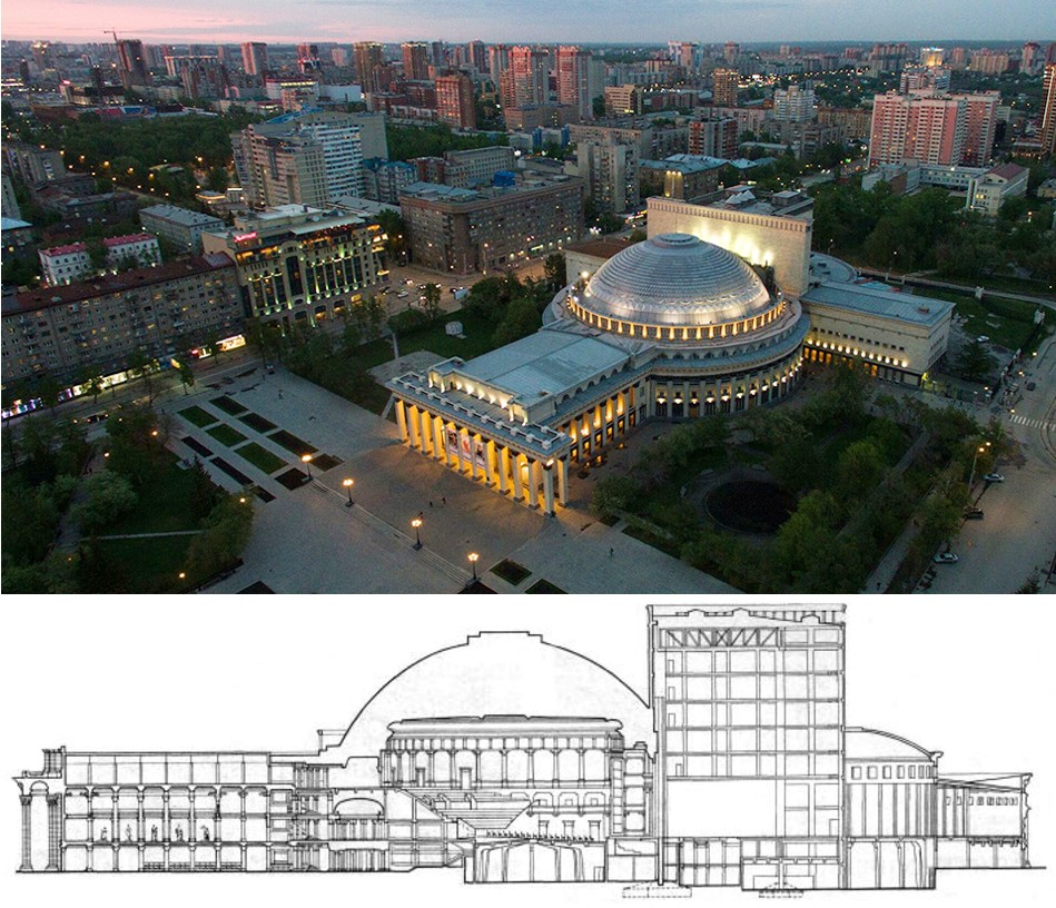 В 1931 г. началось строительство Новосибирского «синтетического панорамно-планетарного театра». Концепция глобальной трансформации пространства зала реализована в первоначальном проекте Дома Науки и Культуры в Новосибирске (рис. 19). Театр представлял новую концепцию технологического планетарно-панорамного синтетического театра в стиле конструктивизма. Он задумывался как объединение различных видов зрелищных пространств, таких как цирк, планетарий, кинотеатр, театр и бассейн для водных выступлений, в одном здании. По плану, зрительные места партера могли превратиться в арену цирка, перенося зрителей на просцениум. В свою очередь, арена могла быть преобразована в бассейн для аквапантомим. Зал театра вмещал до 3000 человек, из которых 2600 могли сидеть в амфитеатре, а остальные в трансформируемом партере. Уникальность колосниковой сцены заключалась в наличии специальных подъемников на нижнем уровне арьерсцены, с помощью которых во время представления могли появляться автомобиль, трактор, лошади. На главной сцене использовались съемные поворотные площадки для смены декораций. Куполообразная форма помещения позволяла проецировать киноленты на 360 градусов. Освещение предполагалось посредством покраски внутренних поверхностей белой светоотражающей краской, без люстр, бра и других осветительных приборов [8].