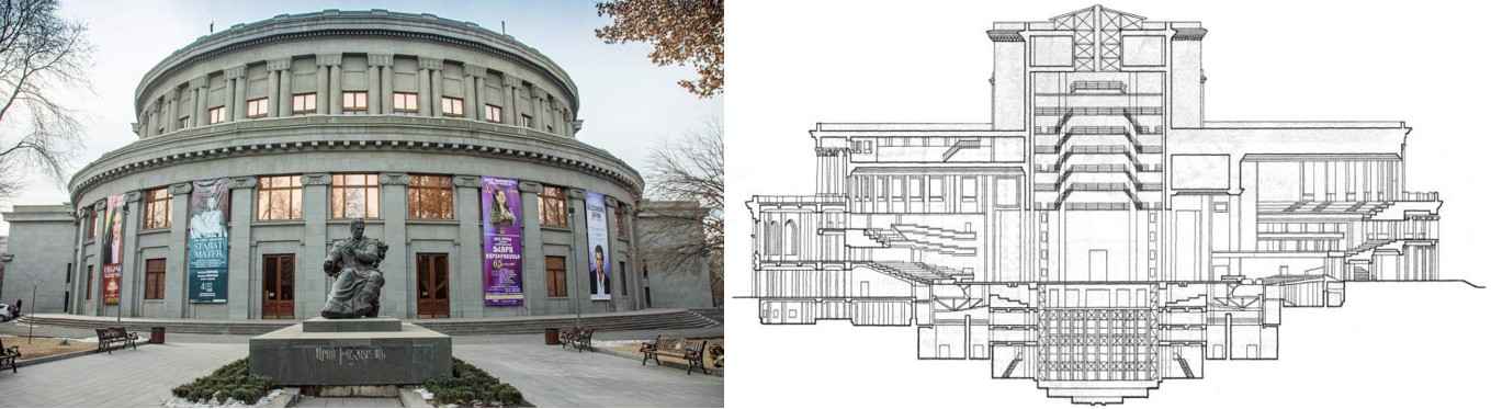 Рис. 20. Театр «Оперы и Балета» в Ереване, Армения, 1939 г., арх. А.И. Таманян: общий вид, разрез (iz.ru)