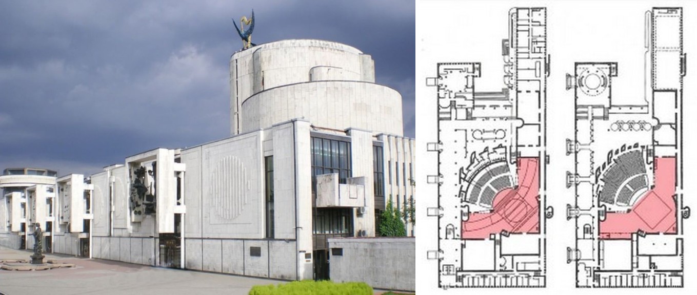 Развитие театральных жанров способствовало популяризации небольших залов, под определенные виды представлений. Появление звукозаписи позволило свободно размещать оркестр и сцену. Новые направления в театральном искусстве, в том числе строительство детских театров, дали толчок к созданию детского музыкального театра имени Н. Сац (рис. 21). Здесь использовались современные технологии и планировочные решения для повышения универсальности пространства (например, трансформируемый, в зависимости от количества зрителей, малый зал). Появление синтетического театра стало важным шагом в развитии театральных зданий [10, 11].