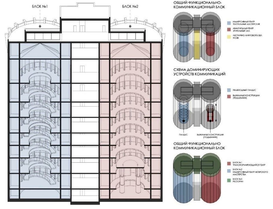 Рис. 23. Концепция приспособления. Блок №1 – школа актерского мастерства; блок №2 – иммерсивный «вертикальный» театр