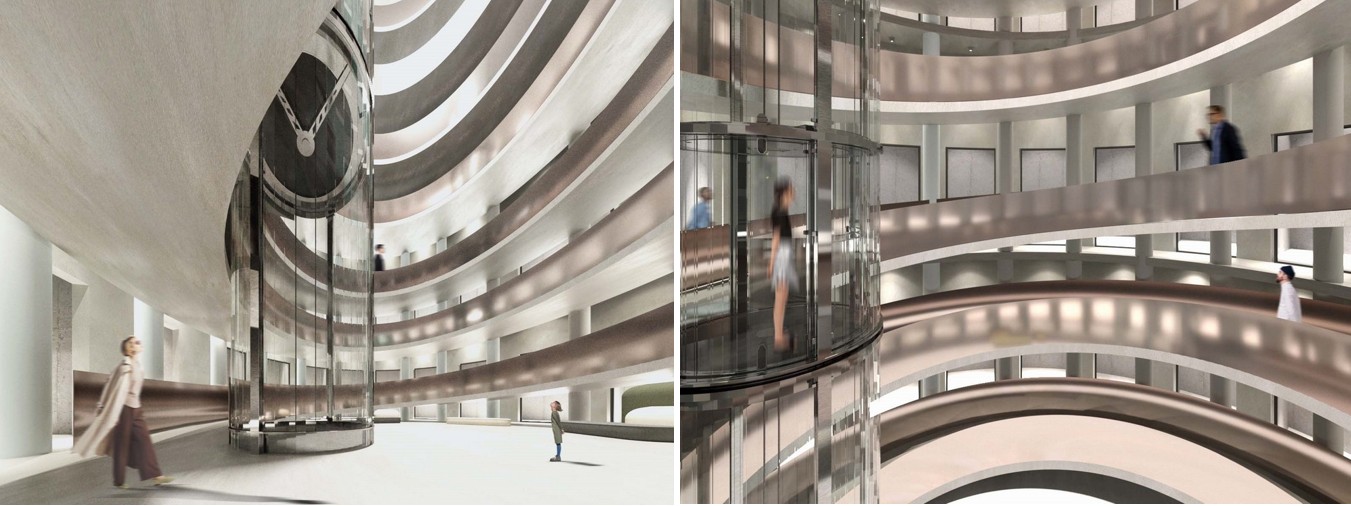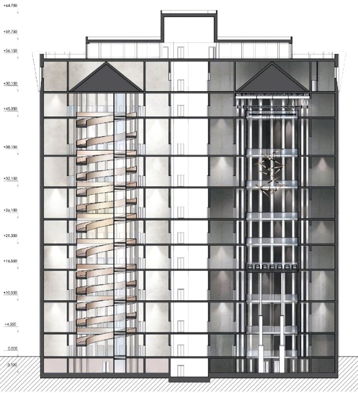 Во втором объеме расположен комплекс театральных студий. Каждый последующий этаж равен одному сценическому жанру. Связующим звеном девяти этажей школы актерского мастерства является пандус и футуристический лифт (рис. 31). Студии могут посещать как театралы-любители, так и ученики школы. Одна из главных идей школы актерского мастерства – открытость и прозрачность, позволяющие посетителям воочию увидеть образовательный процесс и погрузиться в закулисный мир театра. В отличие от театрального блока, в этом цилиндре интерьер выполнен в светлых тонах. В качестве вертикальных коммуникаций применены незадымляемые лестницы типа Н2 и лифтовые блоки.
