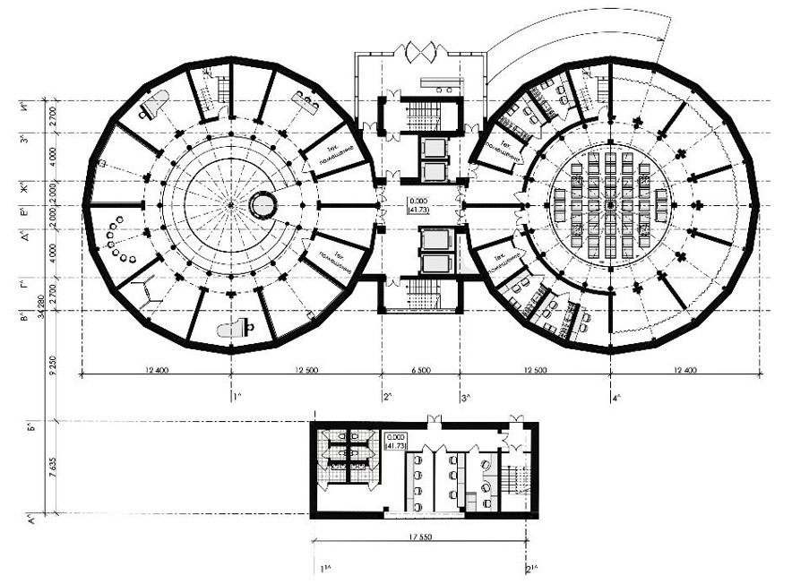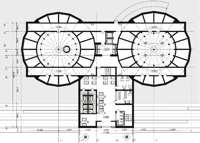 Работы по созданию театра В.Э. Мейерхольда, проектированием которого занимались архитекторы М.Г. Бархин и С.Е. Вахтангов, оказали огромное влияние на строительство театральных зданий советского времени. Согласно их проекту, театр имел эллипсообразную форму, включавшую амфитеатр, с вписанным в нее высокотехнологичным механизированным подъемно-опускным полом сцены, сложную систему доставки декораций из подвала-трюма, стеклянный потолок с естественных освещением и многие другие инновации (рис. 17). Несмотря на это, задумки не были воплощены. В 1938 г. театр В.Э. Мейерхольда на этапе реализации был закрыт, в 1939 г. Мейерхольд арестован и затем расстрелян, а в 1940 г. театр был перестроен в концертный зал имени П.И. Чайковского, выполненный архитектором Д.Н. Чечулиным [5, 7].