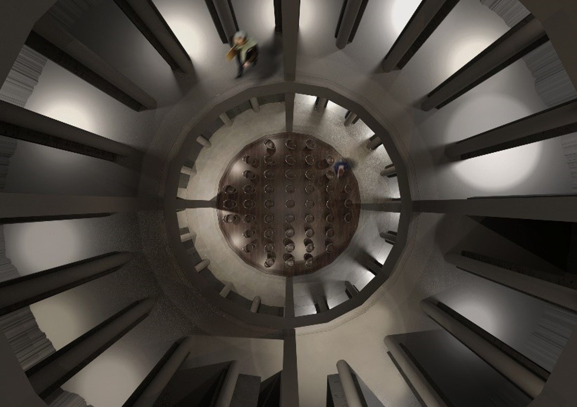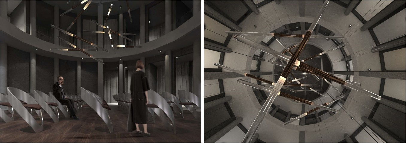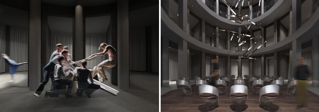 Рис. 30. Визуализация блока «вертикального» театра и вид снизу на подвесную поднимающуюся люстру