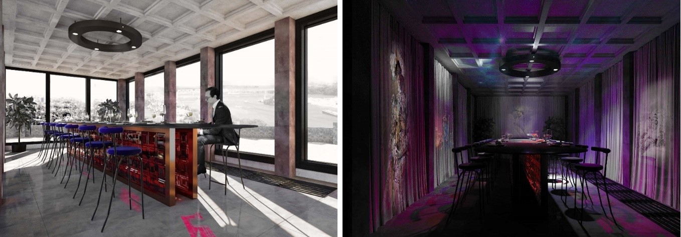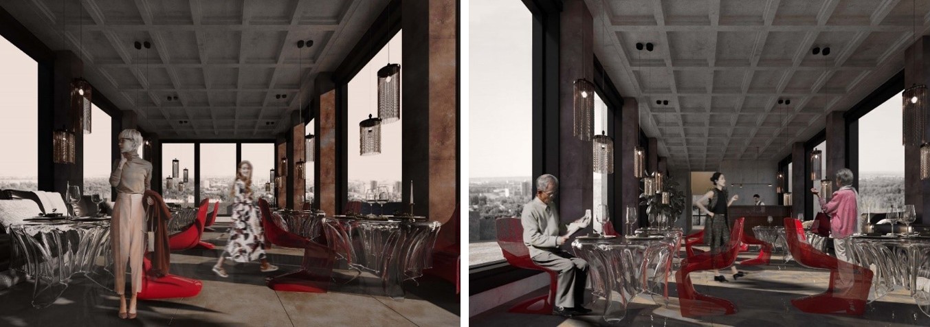На кровле запроектирован панорамный ресторан с выходом на эксплуатируемую кровлю на отметке +56,150 м, на которой организована видовая площадка (рис. 32, 33). Ресторан является также местом проведения иммерсивных гастро-театральных представлений (рис. 34). Основная концепция гастро-представлений – связка кулинарных сетов с визуальной составляющей. Для отдельных блюд подобрана посуда под ту или иную тематику, которая транслируется в зале.