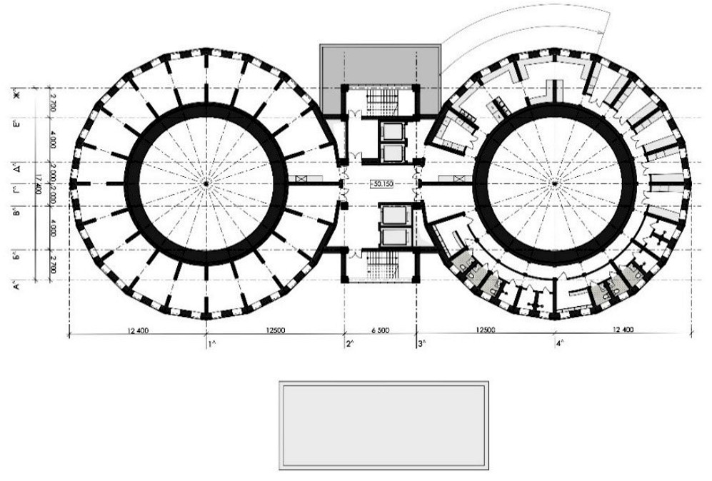 Концепция приспособления. Проектом предлагается сохранить существующее здание элеватора, изменив его функцию на новую – иммерсивный театр. В одной башне предлагается разместить «вертикальный театр», в другой – студии актерского мастерства (рис. 23, 24). В центральном блоке бывшей нории располагаются пассажирские и служебные лифты, а также общие холлы для посетителей. На кровле, в бывшем объеме для размещения транспортеров, предлагается разместить панорамный ресторан с видовой площадкой.