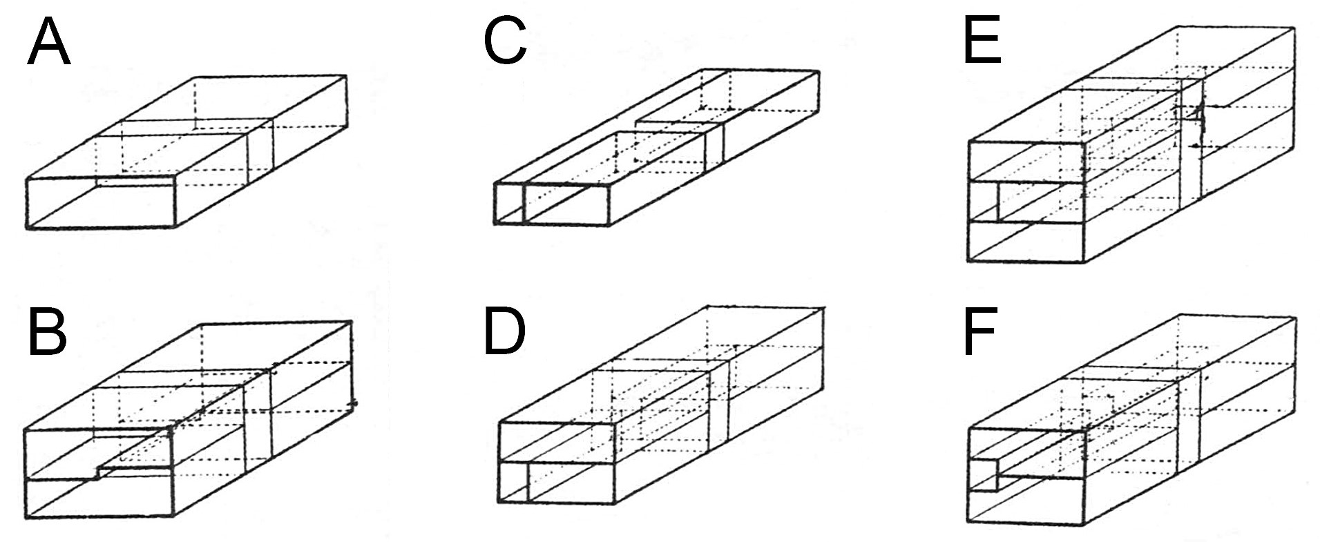 Работа секции типизации Стройкома, организованной в 1928 году, заслуживает особого внимания. Её возглавлял М.Я. Гинзбург, под руководством которого работали М.О. Барщ, В.Н. Владимиров, А.Л. Пастернак и Г.Р. Сум-Шик. Коллектив развивал конструктивистскую линию ОСА, которое с 1926 года сконцентрировалось на вопросах проектирования жилья с предельно рациональным ведением бытовых процессов посредством обобществления и самообслуживания [13]. Задачей секции типизации стал поиск экономически эффективных схем многоквартирных жилых домов. Было разработано 6 базовых типов моделей – A, B, C, D, F и E. В двух первых использовалась секционная схема интеграции жилых ячеек квартирного типа – с вертикальными связями по лестничным клеткам, а в четырех других – коридорная схема с боковым естественным освещением и организацией лестниц через каждые 50 м. Схема С была задумана как гостиничная, схемы D и F – как квартирные, схема E – как коммунальное жильё типа общежития (рис. 2). Каждый базовый тип схем был представлена несколькими модификациями (рис. 3) [13, 14]. Переменными величинами были ширина корпуса, площадь жилых и вспомогательных пространств, их количество и высота. Менялись схемы распределения бытовых удобств, и прежде всего – кухонь и ванных. Расчёт эффективности строился на поиске оптимального соотношения между общей кубатурой здания и полезной площадью ячеек.