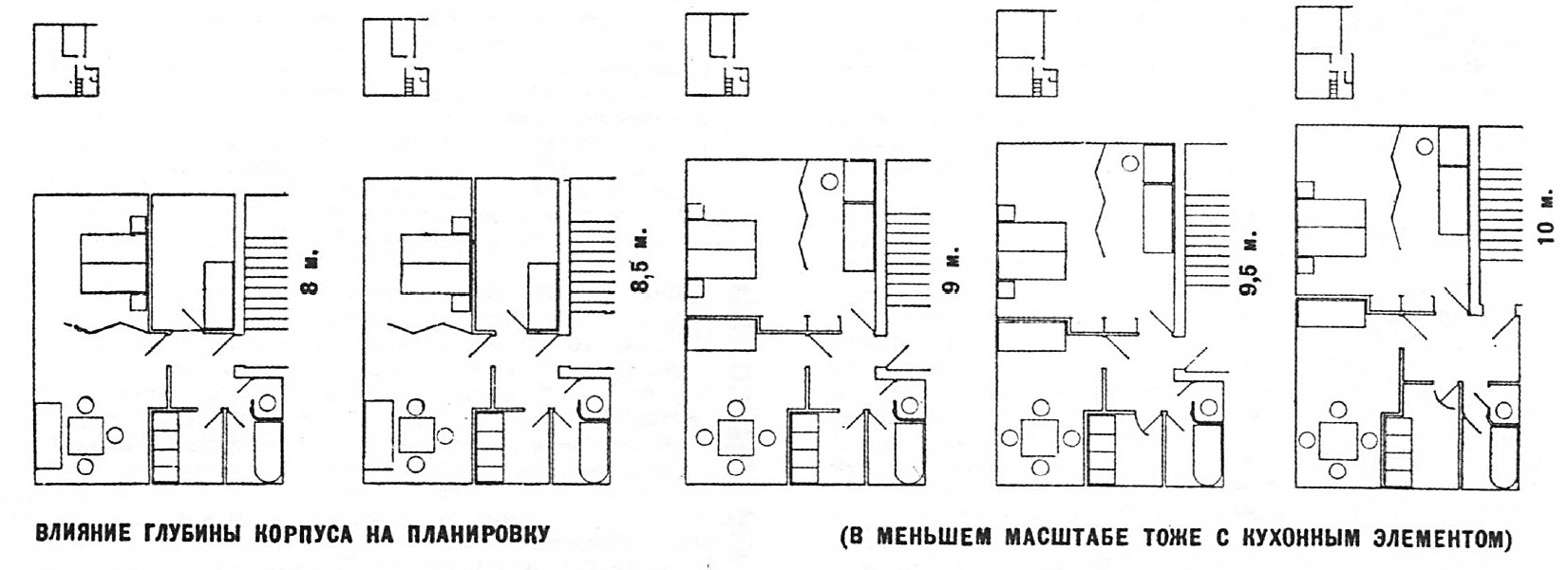Рис. 3. Влияние глубины корпуса жилого дома на планировку жилых ячеек – предложения секции типизации Стройкома [15]