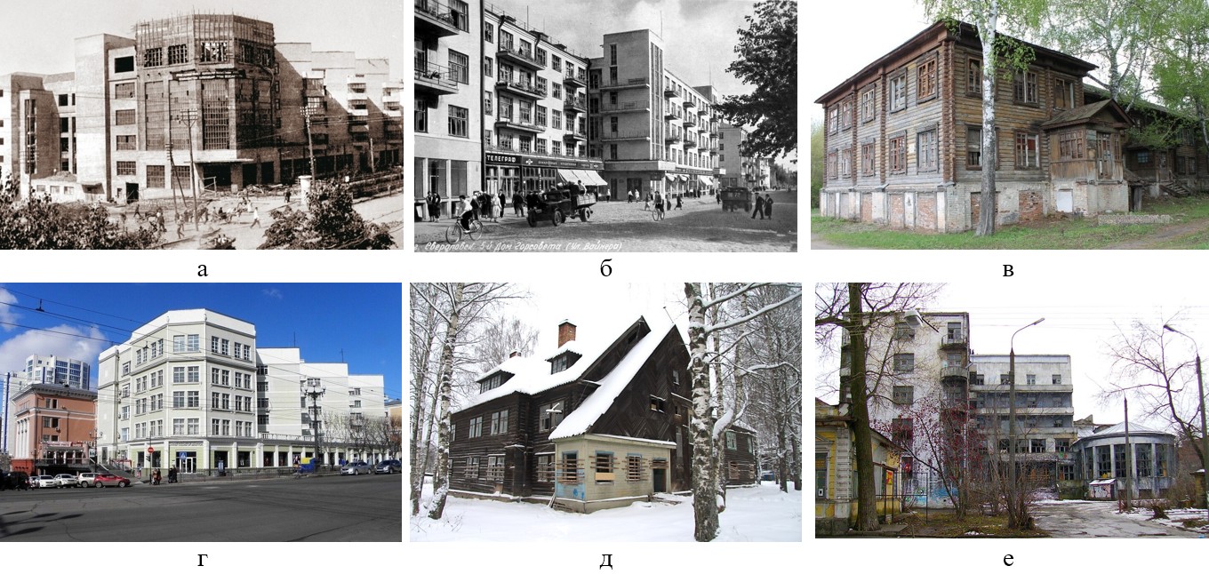 Рис. 4. Дома-коммуны, построенные в СССР: а, г – Дом-коммуна работников НКВД в Хабаровске (фото во время строительства и современное) [16, 17]; б - 5-й Дом Свердловского горсовета в Екатеринбурге [18, 19]; в - Ирская коммуна в с. Ленинское Тамбовской области [20, 21]; д - Дом-коммуна в пос. Чагода Вологодской области [22]; е - Дом-коммуна «Дом чекиста» в Нижнем Новгороде [23, 24].