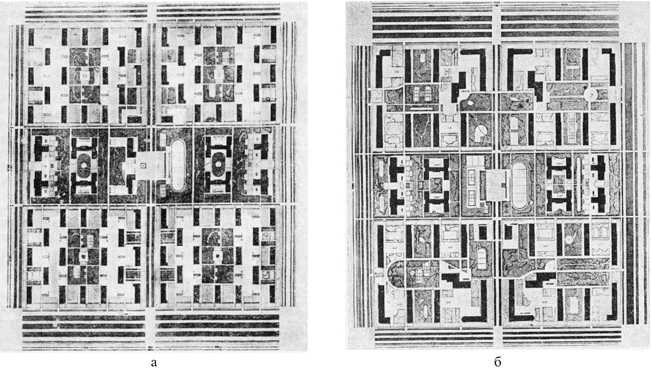 Рис. 7. Посёлок Бобрики: а – типовой квартал с облегчённой застройкой, б – типовой квартал с капитальной застройкой [37]