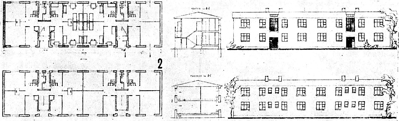 Обстоятельная дискуссия о том, как формировать среду советского индустриального города развернулась вокруг планов развития посёлка Бобрики (впоследствии – г. Сталиногорск, сейчас – г. Новомосковск Тульской области). Здесь в конце 1920-х гг. было решено построить химкомбинат, который становился ключевым градообразующим звеном города с населением примерно в 50 тыс. чел. В 1929 г. Московское архитектурное общество (МАО) объявило конкурс, завершившийся победой архитекторов А.Э. Зильберта и Л.З. Чериковера. Несмотря на успех, их работа была жёстко раскритикована и охарактеризована как относящаяся к капиталистическому типу. Однако, она стала основой комплексного проекта планировки, который продолжили проектировщики специально созданного при Мосхимэнергострое отдела. Проект этот был завершён и представлен в 1932 г. на научно-технической конференции, устроенной специально для обсуждения планов строительства Бобриковского комбината, однако это не помешало начать строительство первого квартала до его официального утверждения. Согласно проектным предложениям в Бобриках предполагалось строить стандартное жильё двух видов – «облегчённое» (деревянное быстровозводимое – на период строительства комбината) и каменное капитальное (после 1932 г.) (рис. 7), а также двух типов – многоквартирное (80 % домов – для семейных) и общежития (20 % домов – для одиноких и бездетных). Допускалась блокировка жилых секций разных типов [37, 38].