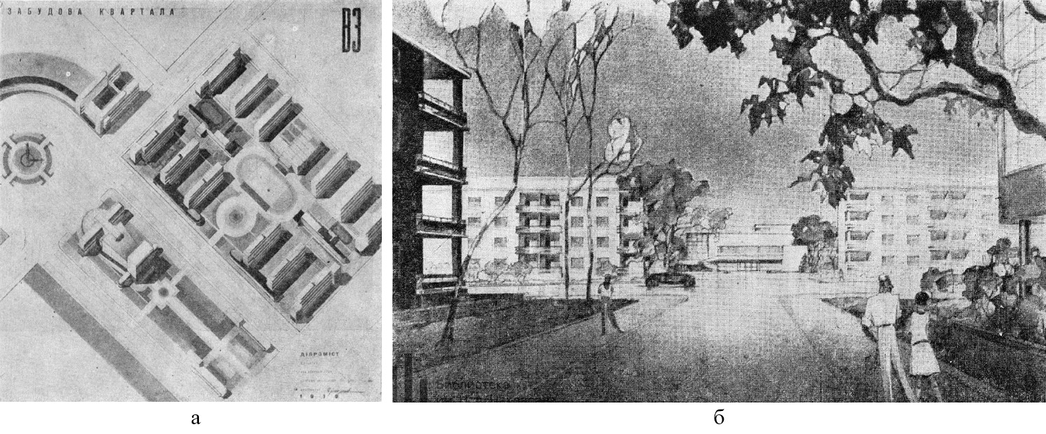 Рис. 9. Проект планировки социалистического города Большое Запорожье (Гипроград при Наркомхозе УССР): а – схема застройки квартала, б – общий вид жилого квартала [40].