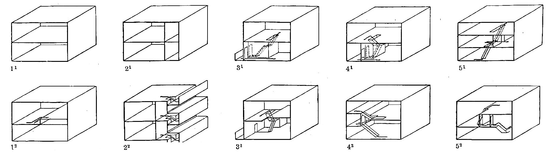 Исследование Хигера было основано на изучении развития комбинаторных характеристик планировочных решений. Были выявлены как простые, так и сложные варианты включения вспомогательных функций. В итоге была составлена таблица типовых решений, а само исследование было заявлено как пособие по проектированию жилых ячеек. Несомненным достоинством этой работы следует считать анализ типичных для домов-коммун двухуровневых ячеек т.н. «пространственного» типа (рис. 11). Важно, что автор высказал мнение о вульгарности проектных решений с радикальным обобществлением быта, которое не связано с обеспечением людей бытовыми удобствами [44].