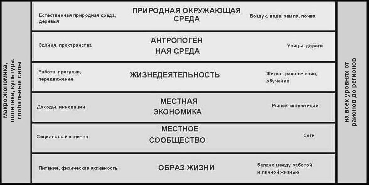 В работе Хью Бартона «Карта здоровья для градостроителей: на пути к концептуальной модели здоровых устойчивых поселений» в 2005 г. представлены факторы, влияющие на здоровье горожан [10] (рис. 3).