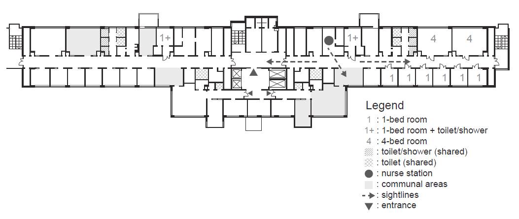 Рис. 1. План этажа старых психиатрических центров в Швеции (1 - одноместные палаты; 1+ - одноместные палаты с туалетом/душем; nurse station - зона медсестры; туалет/душ; 4 - четырехместные палаты; communal areas - общая зона пребывания пациентов) [3]
