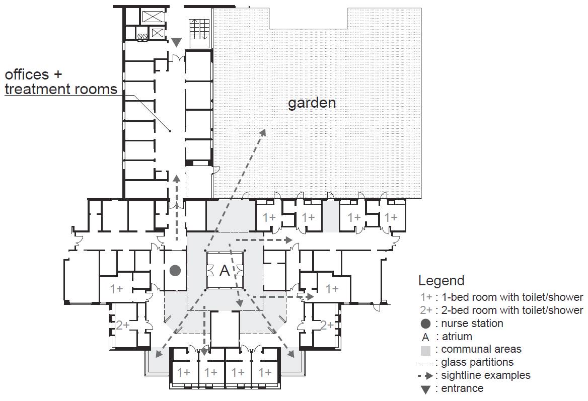 Рис. 2. План этажа новых психиатрических центров в Швеции (1+ - одноместные палаты с туалетом/душем; 2+ - двухместные палаты с туалетом/душем; nurse station - зона медсестры; A – атриум; communal areas - общая территория пребывания пациентов; garden - зеленое пространство, сад) [3]